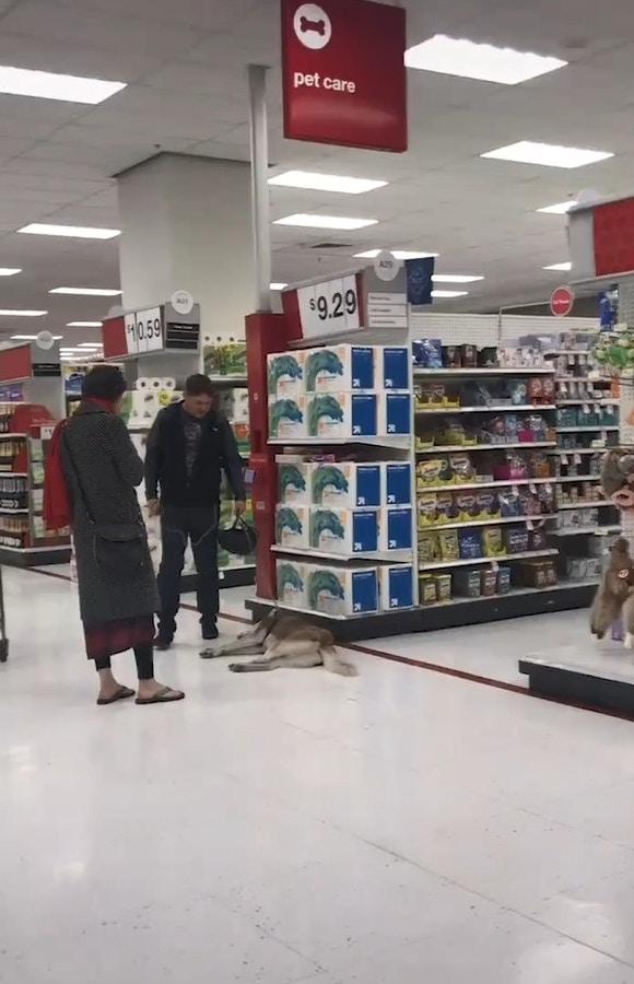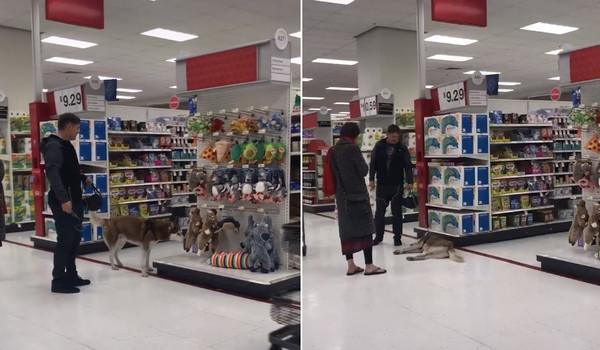 ▼網友偶遇撒嬌耍賴的月月,拍下影片與網友分享。陪著主人好好逛街的月月被貨價上的「娃娃」吸引,站在原地捨不得離開。
