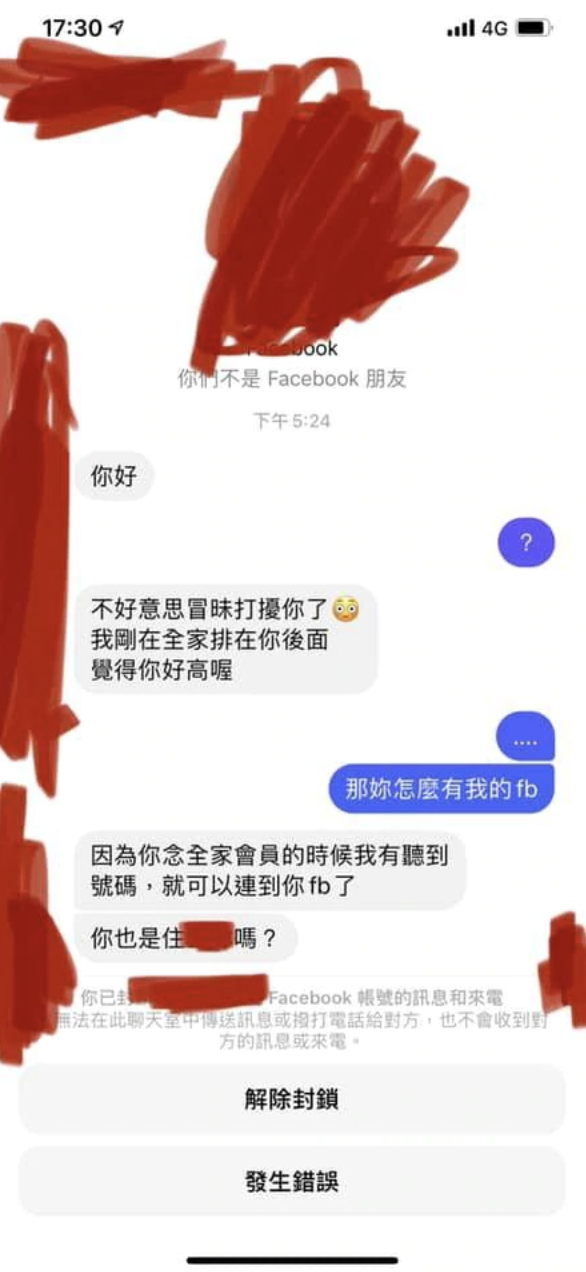 ▼這名網友表示,他的臉書收到陌生訊息,對方說「剛剛在超商排在你後面,覺得你好高」。原po看到這話覺得很反感,這才知道自己在超商裡報電話號碼時被對方記了下來。雖然結帳時報號碼的音量不是特別大,但櫃檯前後的人都能聽到,有時候店員沒聽清的話還會請顧客再唸一遍,顧客報完電話號碼店員也會把部分號碼數字秀在螢幕上,要顧客來確認。這個小細節很容易造成個資外洩。