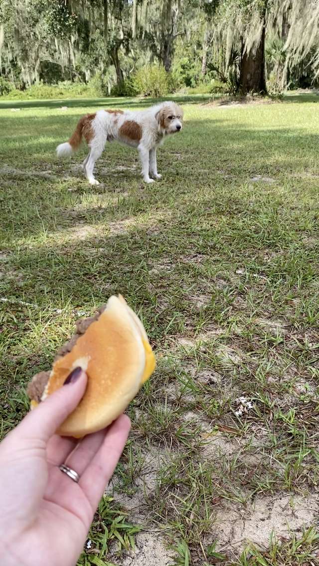 ▼卡莉只好先把2隻狗狗再去安置,不過她不願意就這樣放著機會不管。從那天開始,她每天都會去找機會,試圖獲得牠的信任,「下班後,我就會去麥當勞買10個不加醬料的起司漢堡,趕去教堂機會休息的地方。我會坐著離牠有段距離,把漢堡扔過去,最久持續了3小時。」