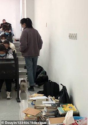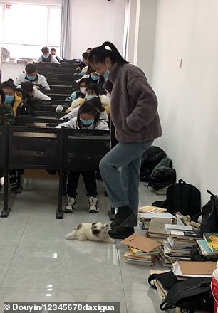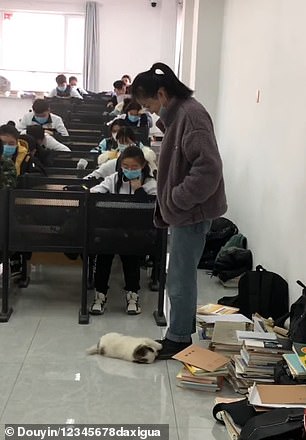 ▼當時學生們正在考試,其中一隻小狗就跑去找老師玩,還追逐老師的鞋子。老師也很喜歡牠,陪牠玩了一會兒。老師準備巡視考生狀況時,小狗竟然跑步追上,也跟著「監考」起來,似乎沒有玩夠,不想讓她離開。