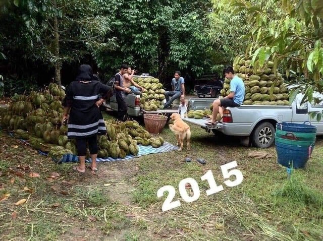 ▼2014年出生不久的Jub Jib就開始在榴蓮園工作了,每天牠就跟著爸媽的身邊,嗅一嗅剛採摘的榴蓮,像是在檢查榴蓮收成的品質。