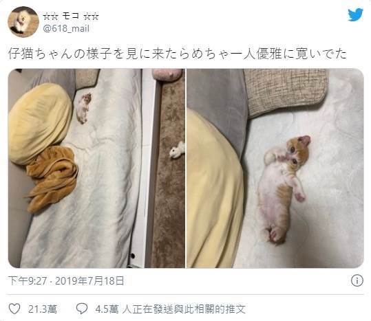 ▼推主忍不住說:「當我去看小貓,就看到牠如此放鬆地躺著……」