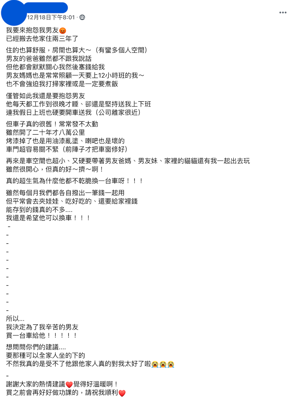 ▼網友們原本以為原po身在福中不知福,沒想到她下一刻話鋒一轉,說:「所以…我決定為了我辛苦的男友買一台車!」原po這才說出自己的真實目的,她不是來抱怨男友的,而是想請教大家買哪一種車款合適。