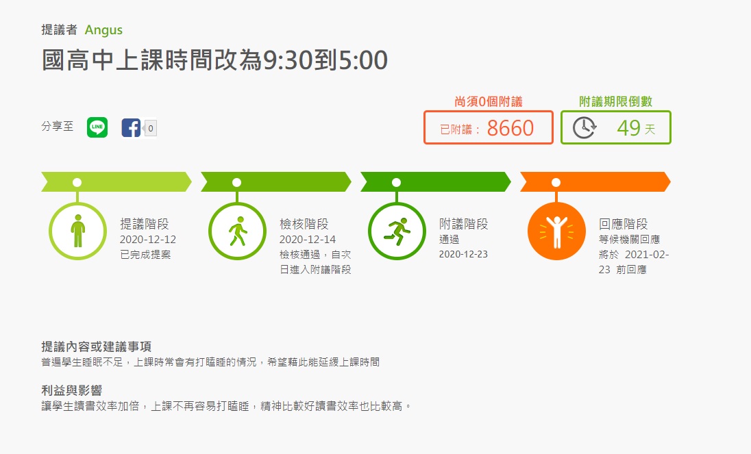 這次「國高中上課時間改為9:30到5:00」的連署已經正式通過附議階段,現在只需要等待相關機構在明年2月23日以前回應,就會知道後續結果如何!