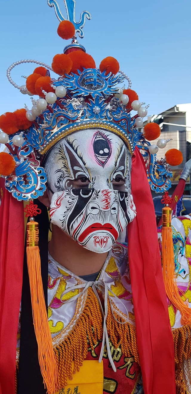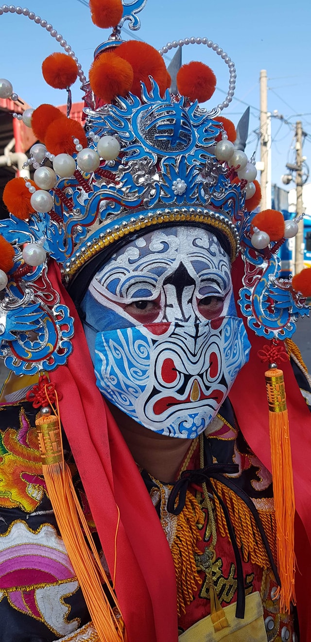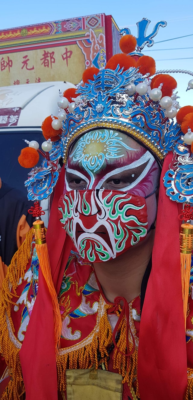 ▼廟方人員將臉譜直接畫在口罩上,跟演員臉上的圖案完美搭配,並表示:「現在因應防疫期間,所以我們星期六出門南下進香,配合政策全程配戴口罩。」廟宇人員不僅精心準備口罩,進香活動全程都有認真配戴。