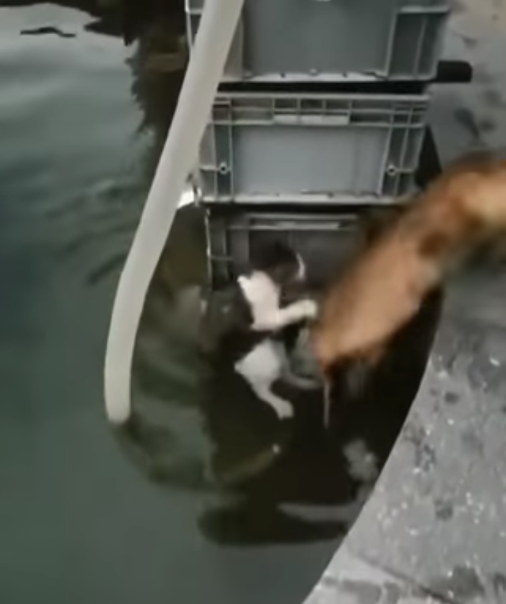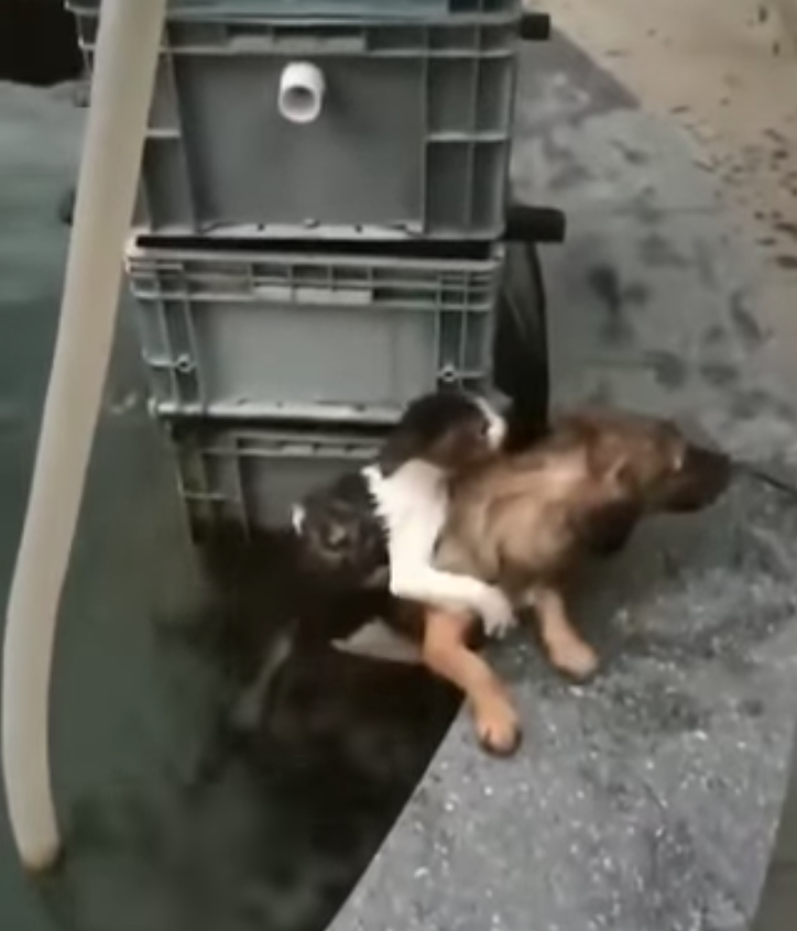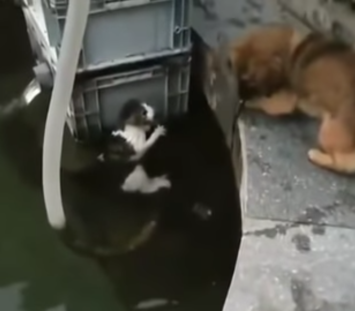 貓咪受困水池剉到發抖 下一秒「英雄汪」跳下去勇救的畫面暖翻天