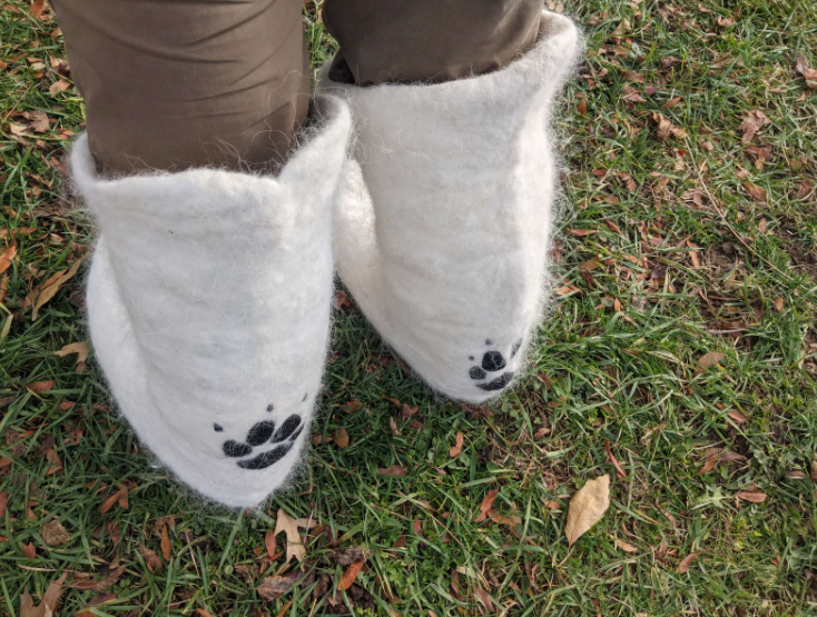 ▼Charlotte收到狗毛後立刻行動起來,她花了48個小時做出一雙毛靴,然後拍照給Soleil看。Soleil看到後讚嘆不已:「我看到用狗毛做出的靴子超激動,Charlotte還加上了狗狗的爪印做裝飾。沒想到用狗毛做的靴子這麼精緻,而且穿起來走路有種跟隨狗狗腳步的感覺,真的超甜蜜!」