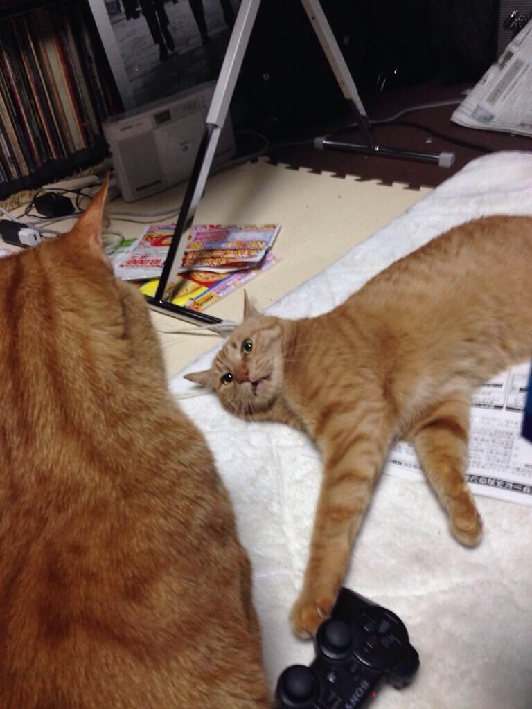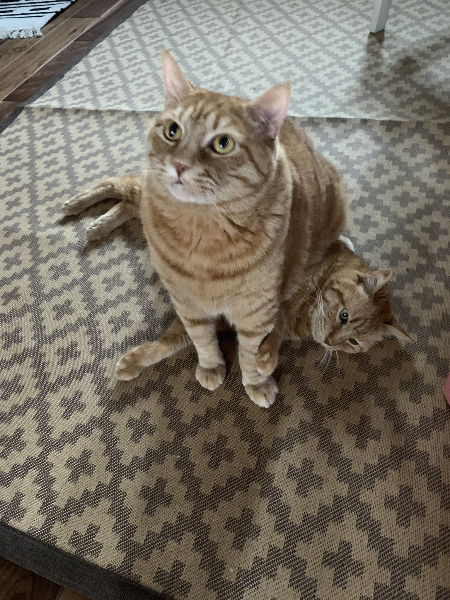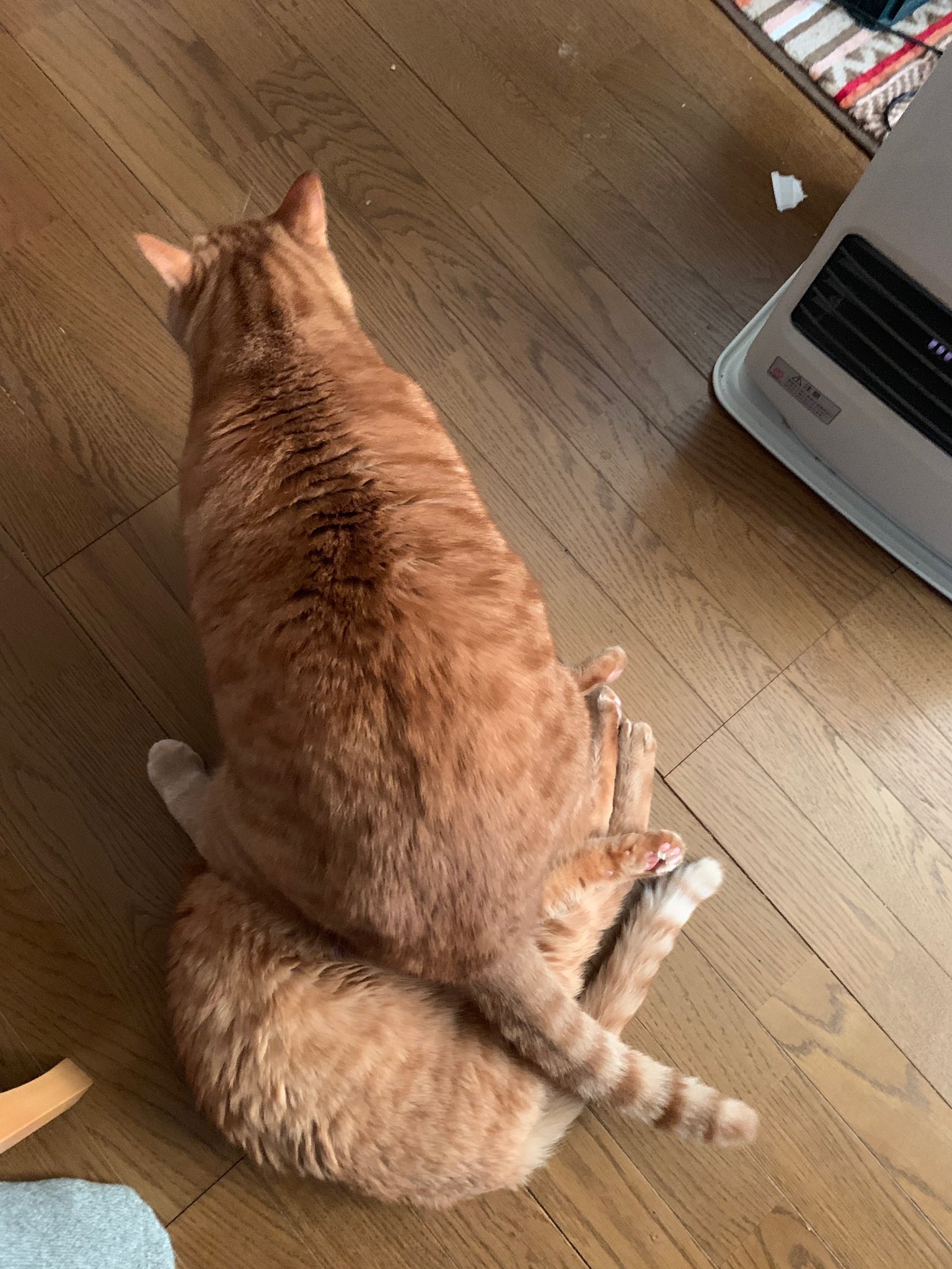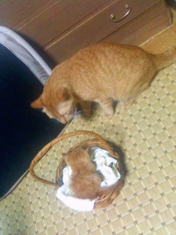 ▼推主表示,家裡先養的貓叫「喵喵」(ニャンニャン)。有一天晚上媽媽經過一家燒肉店的停車場,看到一隻餓肚子的瘦弱橘貓正在舔地上的糖果。媽媽覺得貓咪太可憐,就將牠帶回家收編,並取名為「小喵」(コニャン)。剛開始兩隻貓咪相處得很好,小喵體型小很多,喵喵沒有不理牠,反而對牠很好。