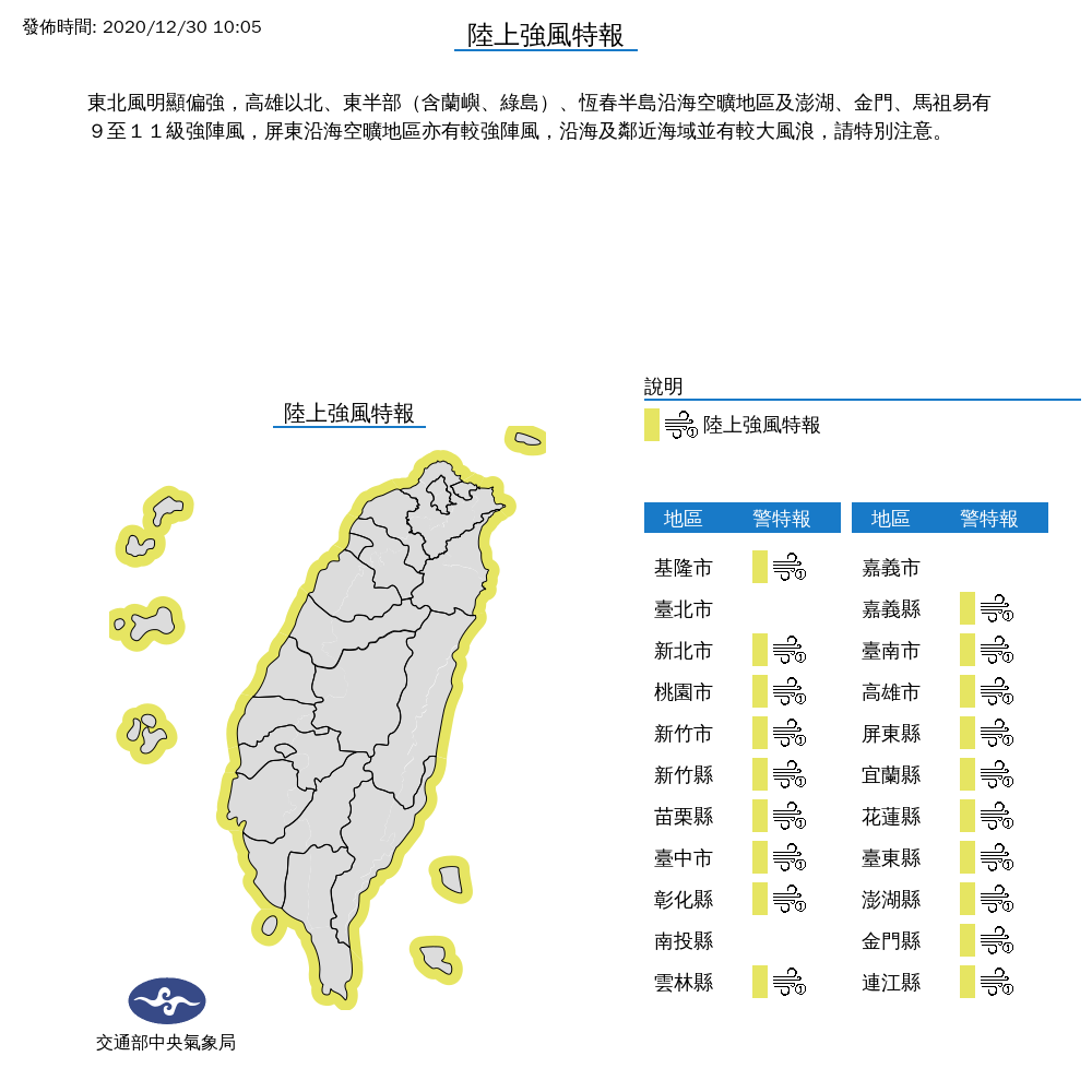 ▼氣象局簡任技正伍婉華指出,這波寒流南下,因為風力較強,體感溫度會讓民眾感覺較冷,氣象局也發布低溫特報與強風特報,下午起至周四各地氣溫明顯偏低,全台22縣市都有10度以下氣溫發生機率,其中北北基宜桃竹苗等7縣市有6度以下氣溫(橙色燈號)發生機率,19縣市都有強風特報,請民眾注意防範,山坡地可能要預防霜害,農漁養殖業要防寒害。