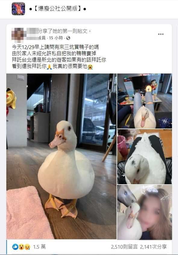 「心愛寵物鴨」被家人偷賣 桃園正妹急壞哭求:拜託還給我!