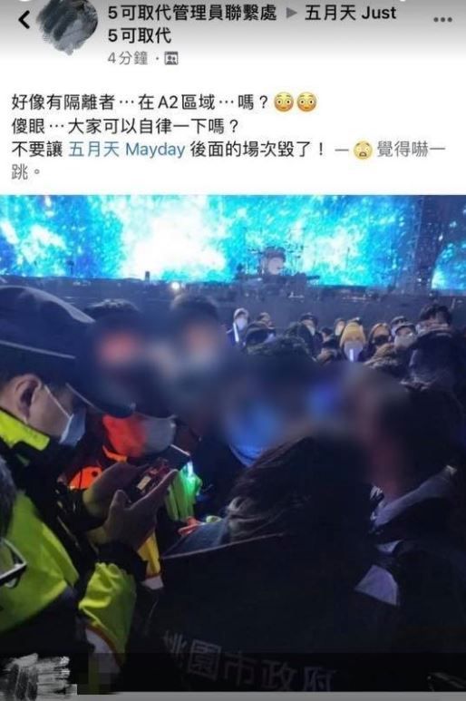 2021年01月01日五月天「好好好想見到你」跨年演唱會於31日晚間登場,歌迷們頂著10度低溫來到桃園國際棒球場。沒想到演唱會進行到一半,突然有警方出現,將一名歌迷帶離現場,原來那是疑似自主健康管理者。網友們得知這件事非常憤怒:「怎麼有這樣的人?!」