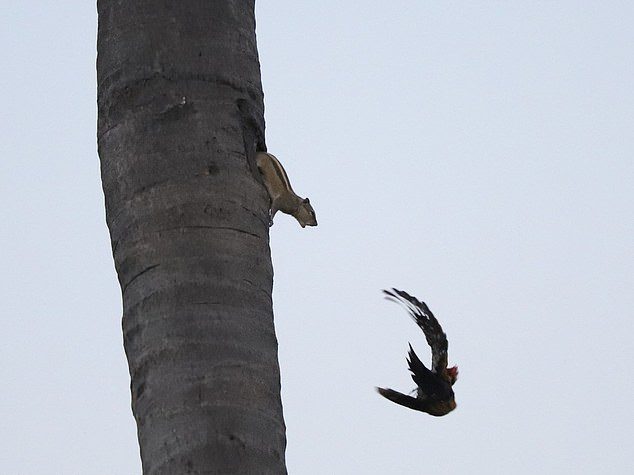 ▼啄木鳥被嚇到,連忙飛走去尋找其他目標。牠明明看到樹洞裡有松鼠在休息,還執著地啄樹幹,難怪松鼠會生氣。