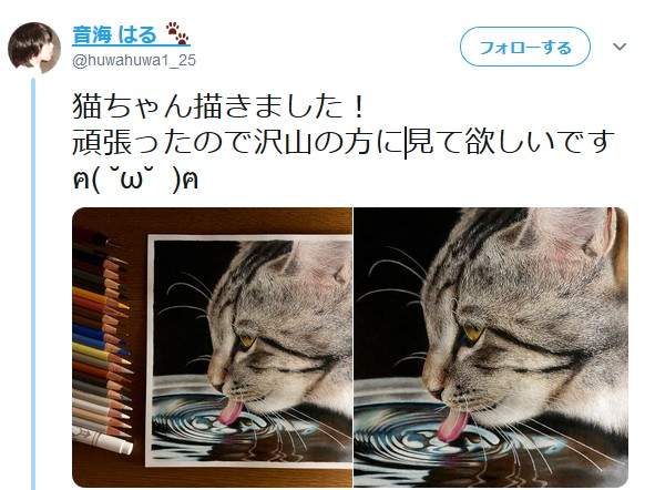 2021年01月03日日本的推特上真的藏了超多的神人!下面這位推主「音海 はる???? @huwahuwa1_25」就是一位超強的畫家,他畫的毛髮和水波紋都逼真到不可思議的地步,如果沒有告訴你真相,真的看不出那隻是畫!
