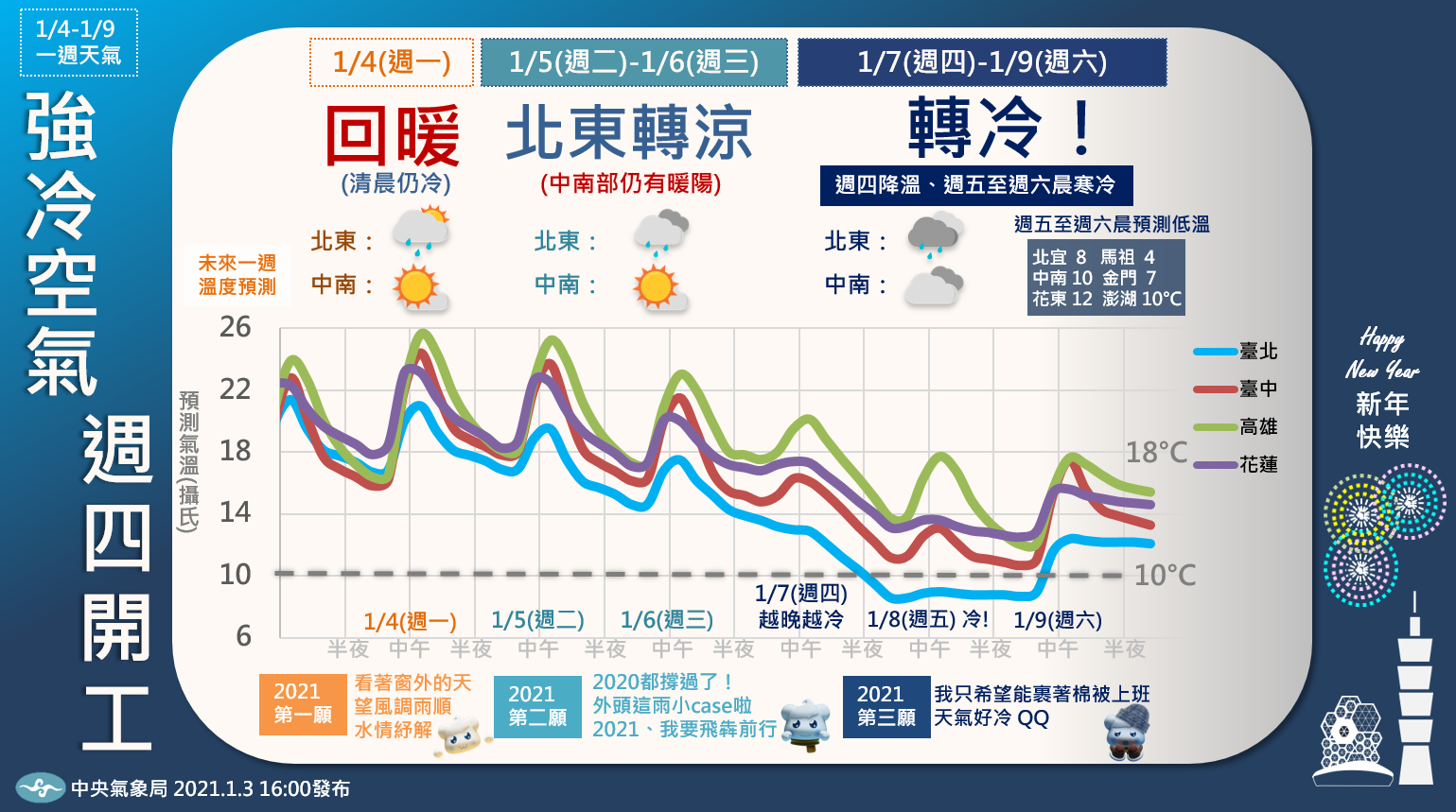 2021年01月04日這幾天冷空氣持續減弱,各地氣溫明顯回升,白天舒適、早晚微冷。今天水氣增多,早上中央氣象局還發布大雨特報,指出基隆北海岸和大臺北山區有局部大雨發生的機率。最新歐洲中期預報中心模式模擬顯示,週四(7日)會有另一波「強冷空氣」南下。