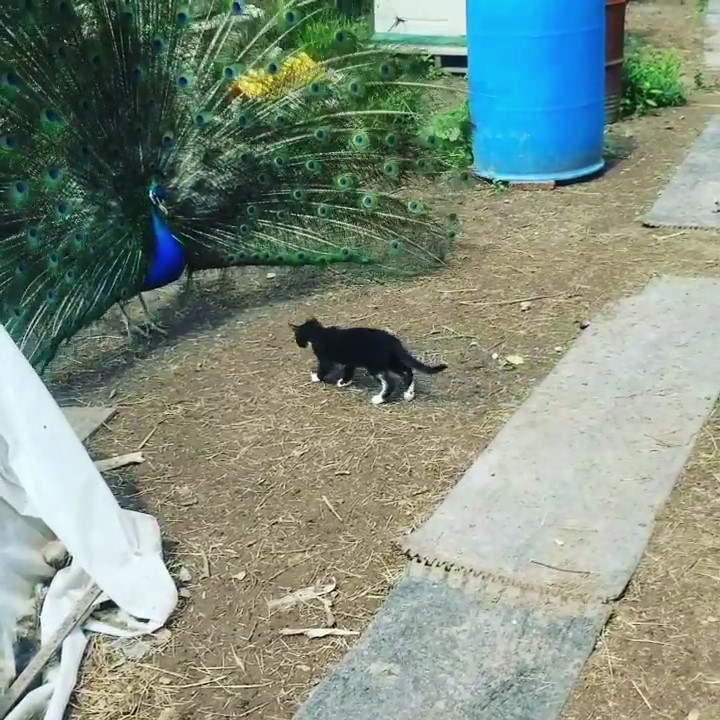 ▼農場主人Vincent Browning和妻子Shelly Lumpkin收編了許多動物,包括網紅長角牛,還有雞、豬、狗狗、貓咪和孔雀,以及一隻新來的小貓咪。這天小貓咪在農場內閒逛的時候,突然看到了孔雀「BlueBoi」開屏的絕美畫面。