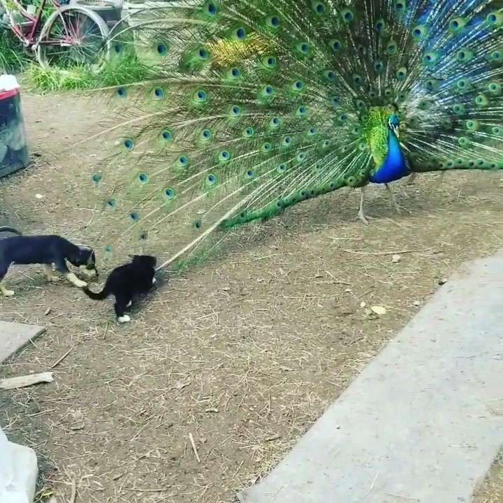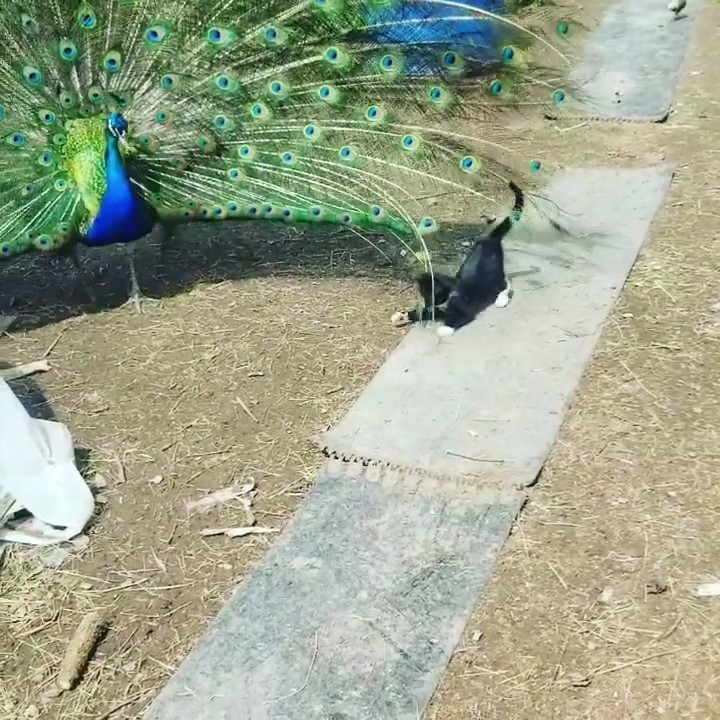 ▼小貓咪不停地撲羽毛,玩的不亦樂乎,孔雀BlueBoi顯然不想自己珍貴的羽毛被牠玩弄,有意躲閃,「小P孩,我開屏不是為了給你玩的啦!」。但是玩得超嗨的小貓咪只覺得不斷移動的逗貓棒太有趣了,「你有這麼多羽毛呢!借我玩一會都不行嗎~」