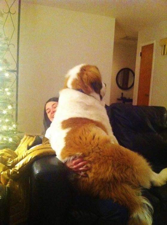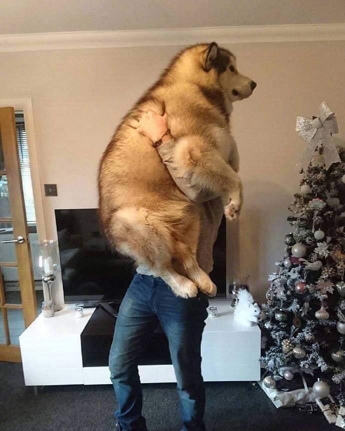 ▼大狗狗雖然體型誇張,但非常可愛,也很親人。狗狗胖成球,還要趴進主人懷裡撒嬌,主人感覺壓力好大。從側面看,主人幾乎消失不見啦~