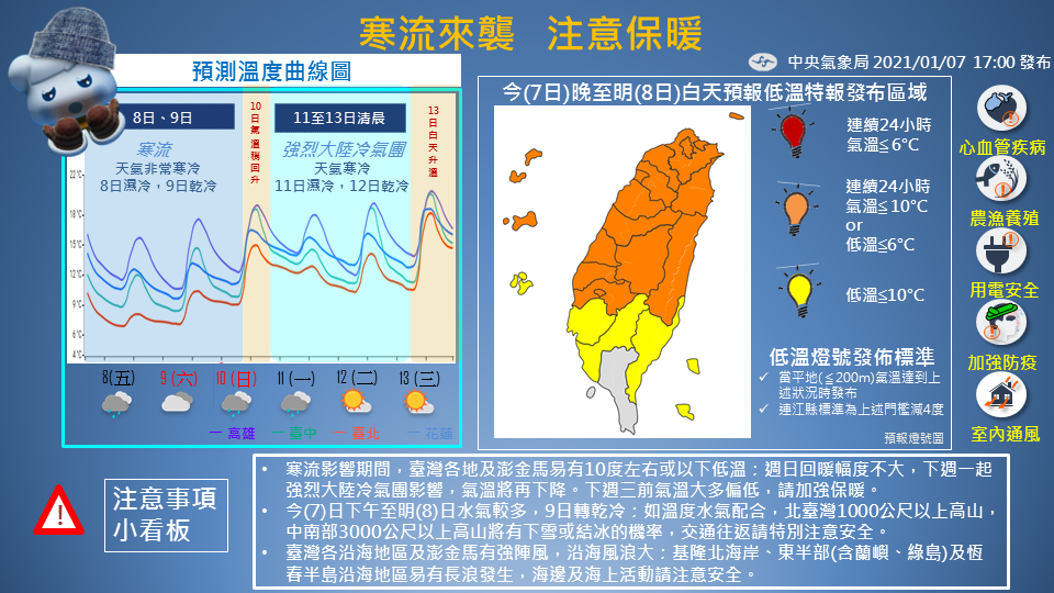 如果想看雪的話,今天北台灣1,000公尺以上高山,中南部3,000公尺以上高山可能會下雪或結冰。氣象局提醒說,這波寒流影響期間,天氣非常寒冷,尤其是高雄以北、東半部及澎金馬,可能出現10度以下低溫。嘉義以北、宜花及金馬長時間持續低溫,體感溫度更低,一定要加強保暖~