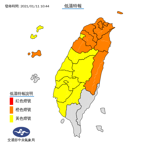 2021年01月11日緊接著今年第二波寒流在週末離去、氣溫稍稍回升,今天(11日)又有強烈大陸冷氣團報到,這是入冬以來的第三波寒流;明天(12日)是這一波冷空氣最冷的時間,中部以北低溫約9度,沿海空曠地區約7度。降雨方面,今明兩天偏溼,之後明顯轉乾。大家一定要多多留意天氣的變化~