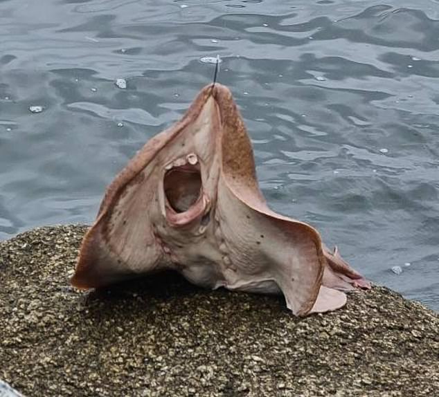 ▼三人捕獲的這隻海洋生物長得很怪異,牠嘴巴大張、面目猙獰,非常醜陋。他們從沒見過這種生物,觀察了一會兒後,用鉗子把魚鉤拔出來,然後將牠放回大海。當時周圍的其他釣客也過來圍觀,大家都沒見過這種魚類,也不知道該怎麼處理。