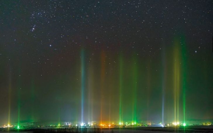 ▼空氣中的冰晶反射形成的光暈,變成了這些光柱。