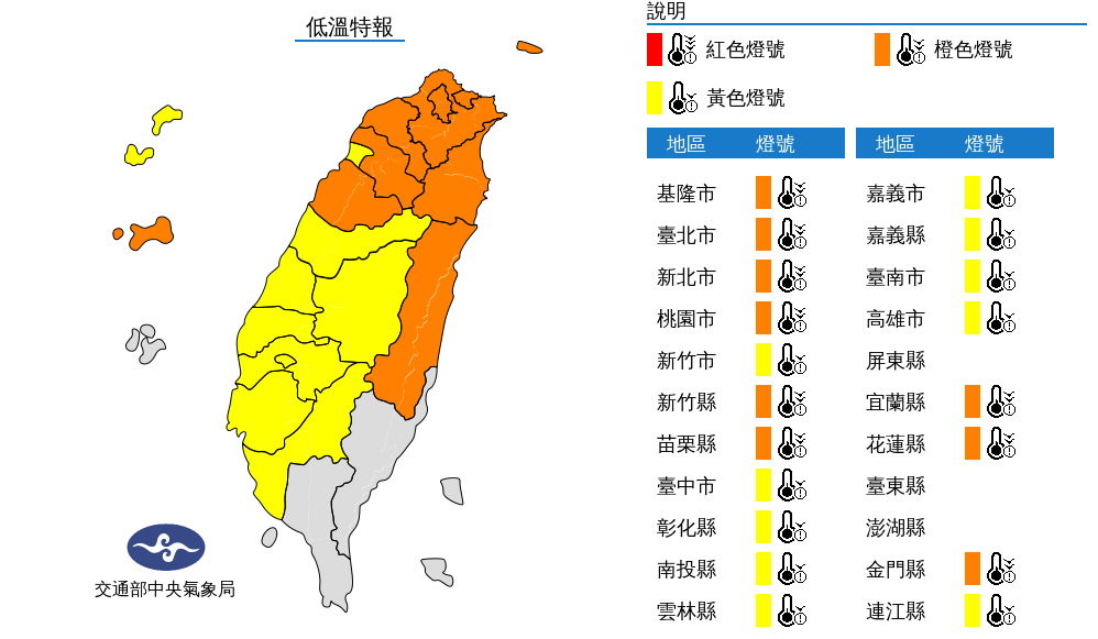 ▼今日乾空氣南下,各地天氣轉晴,氣溫回升。但夜間因為強輻射冷卻作用,北台灣平均氣溫會降到6度左右;週三清晨嘉義以北各地區平地的最低氣溫在4到6度之間,是這一波寒流最冷的時候。
