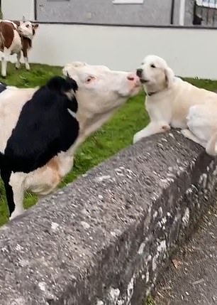 2021年01月12日狗狗很擅長交朋友,牠們不僅能跟人類相處得很好,還能跟其他動物相處融洽~北愛爾蘭弗馬納郡(County Fermanagh)有一隻叫Pablo的2歲金金,牠跟村里的一隻小牛感情很好。雖然這對好友物種不同、體型差別很大,但每次見面都非常親暱,Pablo溫柔舔小牛的臉時,那有愛的畫面讓人心都要融化了。