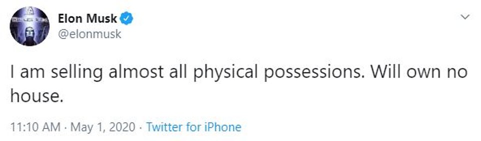 ▼有人猜測他賣掉加州的房產是為了搬到德州生活。他接受採訪時卻說:「除了公司股票之外,以後我幾乎不會持有任何具貨幣價值的資產」,「如果工作比較忙,我就睡在工廠或辦公室裡。如果要顧小孩的話,我自然是需要住的地方,那我就租房子之類的」。
