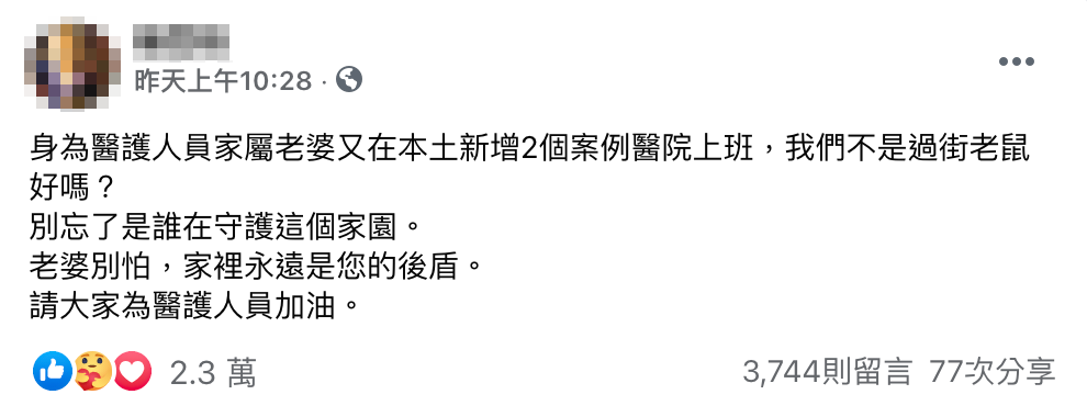 ▼這名男子表示,醫護情侶確診的消息公布後,他感覺到很多人開始刻意避開在案例醫院上班的醫護人員。這讓他非常心寒,「別忘了是誰在守護這個家園」。他還對愛妻喊話,希望對方了解,不管發生什麼事,他都會陪在妻子身邊:「老婆別怕,家裡永遠是您的後盾。請大家為醫護人員加油。」