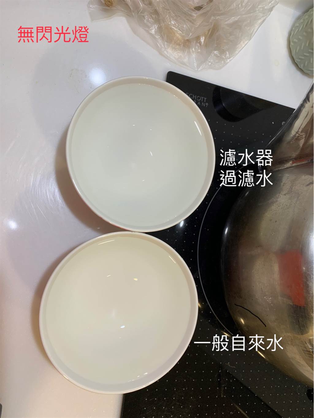 ▼原po本以為水塔出了問題,但去頂樓察看發現沒有異樣,水塔的蓋子也蓋得好好的。他打電話詢問自來水公司,因為當時已是深夜,只讓他語音留言。隔天早上他用2個同款白瓷碗裝水,發現經過濾水器的過濾水跟自來水顏色差很大。自來水明顯泛黃,而且有一些雜質。