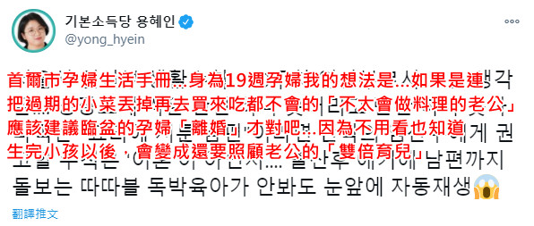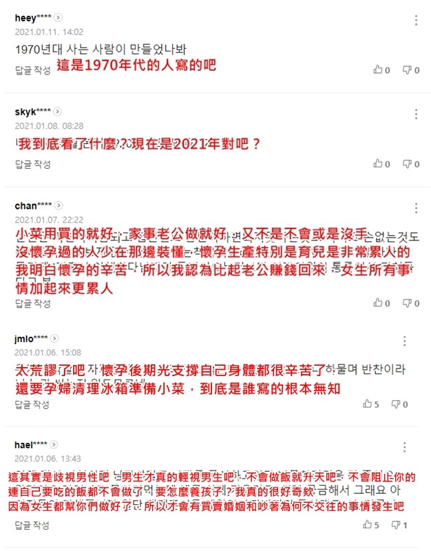 ▼這篇指南是2019年時發布的,只是近日才引發爭議。網友們紛紛留言說:「太荒謬了吧,懷孕後期光支撐自己身體都很辛苦了,還要孕婦清理冰箱準備小菜,到底是誰寫的根本無知」、「這是1970年代的人寫的吧」、「我到底看了什麼?現在是2021年對吧」、「請懲處首爾市懷孕生產資訊中心爭議文章的作者,並要求他道歉」。