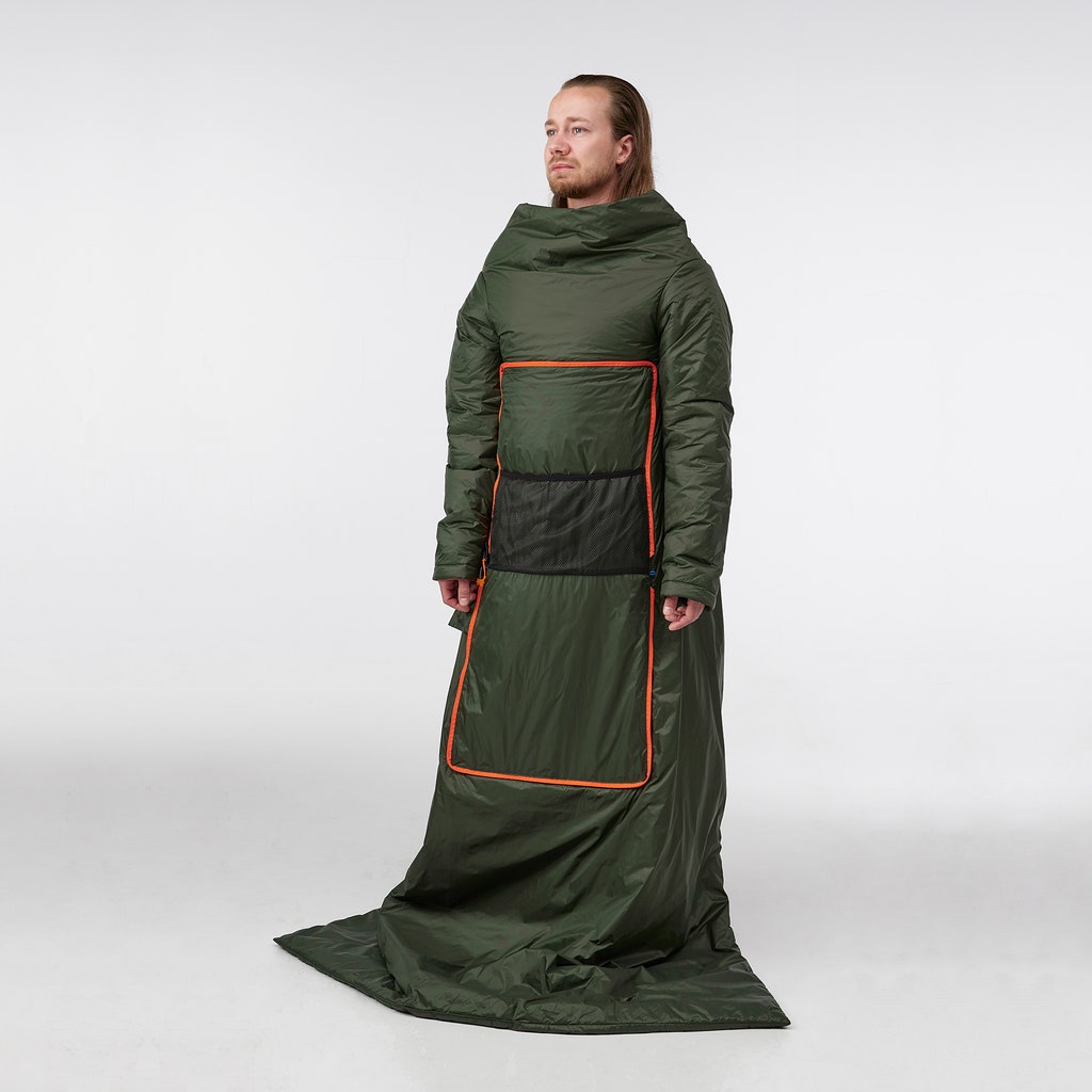 ▼這款「可穿式抱枕 FÄLTMAL」是專為戶外活動設計的,整體採用機能材質,低調的墨綠色也跟自然環境非常搭。抱枕上有一個收納網袋,可以裝一些小物,徹底解放雙手。平時將它裝在網袋裡收起來,不會佔太大空間,就像一個澎澎的抱枕一樣;展開就能穿在身上,非常方便。