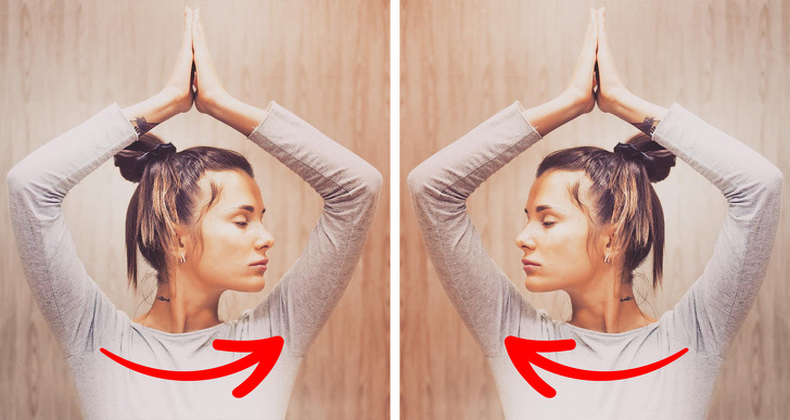 站在地板上,雙腳與肩同寬,雙臂放在身體兩側。接著將手高舉過頭,保持手肘伸直,將手掌合在一起,向上伸展脊椎並維持這個體態數秒鐘,接著慢慢放下手臂,彎曲手肘讓背後的肩胛骨盡量能夠被拉動,維持數秒後重複動作,每次進行約1分鐘。