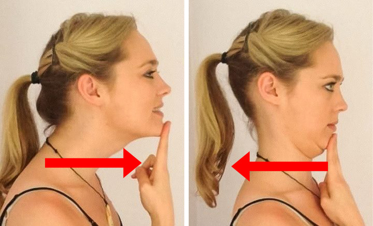坐在椅子或地板上,背部挺直,肩膀稍微向後,頭部直視前方。接著用感覺到不舒服的手臂伸出兩根手指,將它們放在下巴上,先伸出脖子將手指往前推,維持數秒後手指輕輕按向下巴處將其往後推,直到出現雙下巴,保持30秒稍微休息一下,接著重複練習。