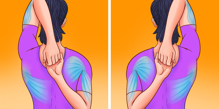坐在椅子或地板上,保持背部挺直,接著將左手放在左耳旁,手掌往後放直到抓住右手,過程中保持背部挺直,將胸部向前推出去,確保手臂和胸部都有伸展的感覺,接著換邊進行,每側進行30秒的時間。