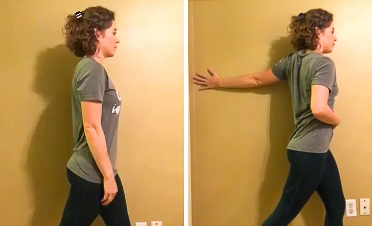 站立在地板上,身體挺直,左側靠在牆壁上,將左腳放在右腳前面。接著慢慢抬起左手手臂往後貼在牆上,保持左臂伸直,將身體盡可能轉向右邊,擴展你的胸部,直到感覺左肩和胸部的肌肉有伸展的感覺,接著換邊進行,每側進行30秒。