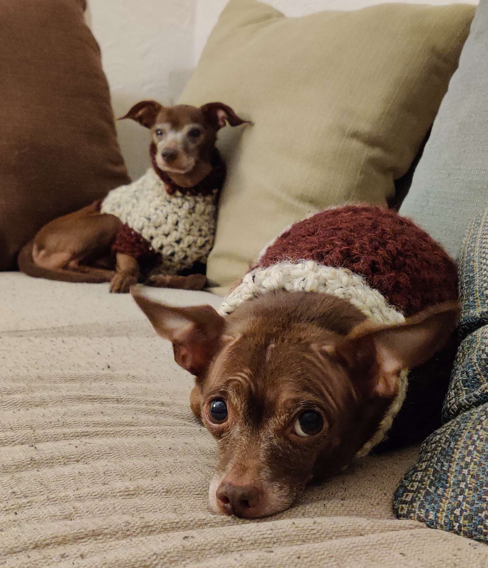 幾個月後,這兩隻狗狗終於找到了一個合適的家庭,能夠安度晚年。中途爸爸為牠們編織的毛衣起到了大作用。新家人承諾,會為牠們準備一些新衣,讓牠們保持潮流~