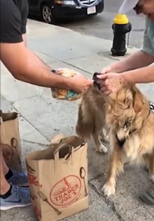 ▼當時Murphy正跟著老婆婆在散步。牠大概聞到了麵包的香味,直接把男子手中的麵包據為己有。主人和男子都讓牠鬆口,牠卻非常堅持。