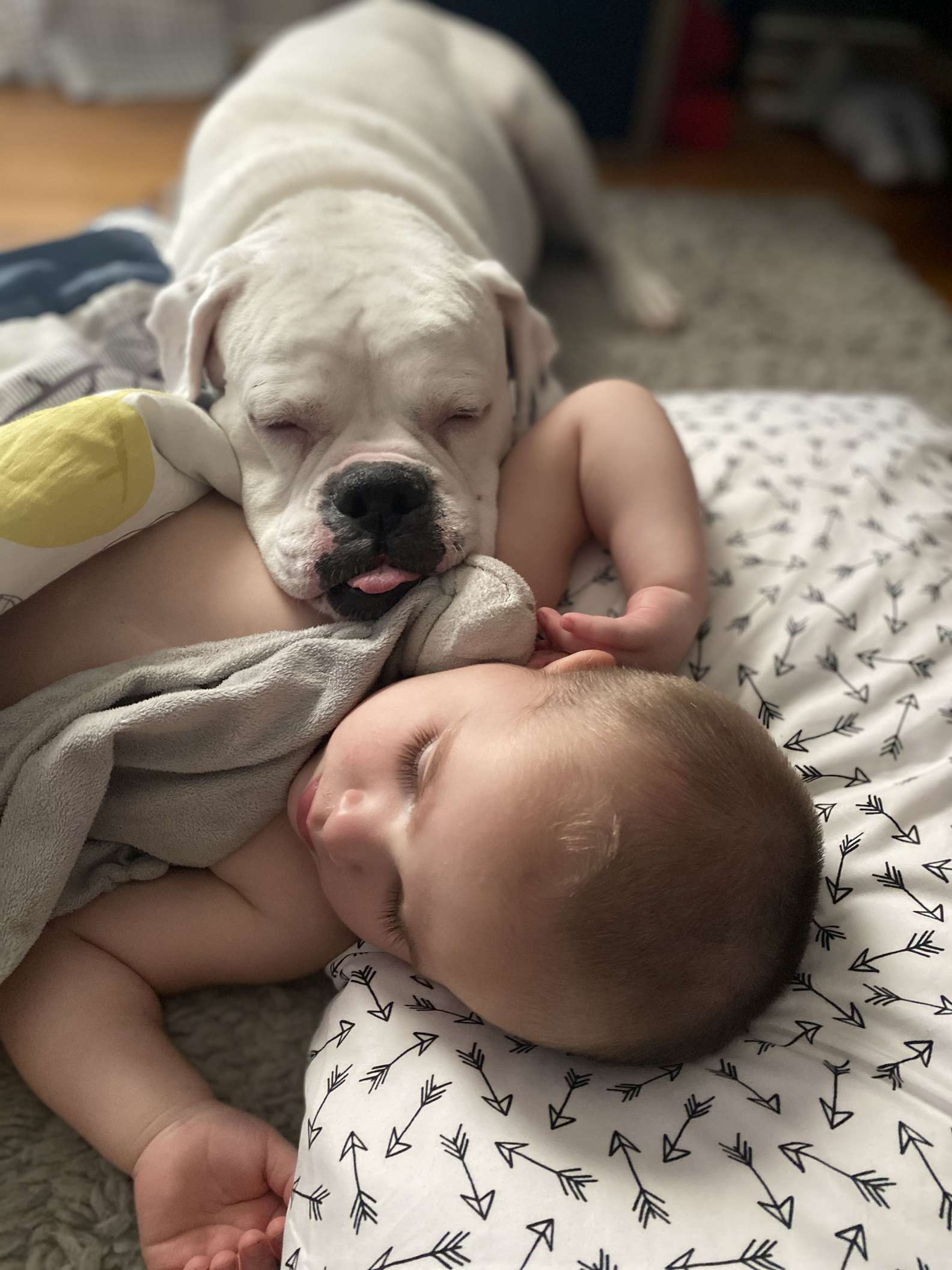 ▼媽媽說:「Brutus會跟著Finn,從一個房間到另一個房間。只要Finn不舒服,牠就會趴在他身邊陪伴。」有一天晚上媽媽查看嬰兒房的監視器,竟然看到了超感人的一幕。只見躺在床上還沒有睡著的弟弟突然從床上走下來,手中還拿著被子,走到Brutus身邊,依偎著牠一起入眠。