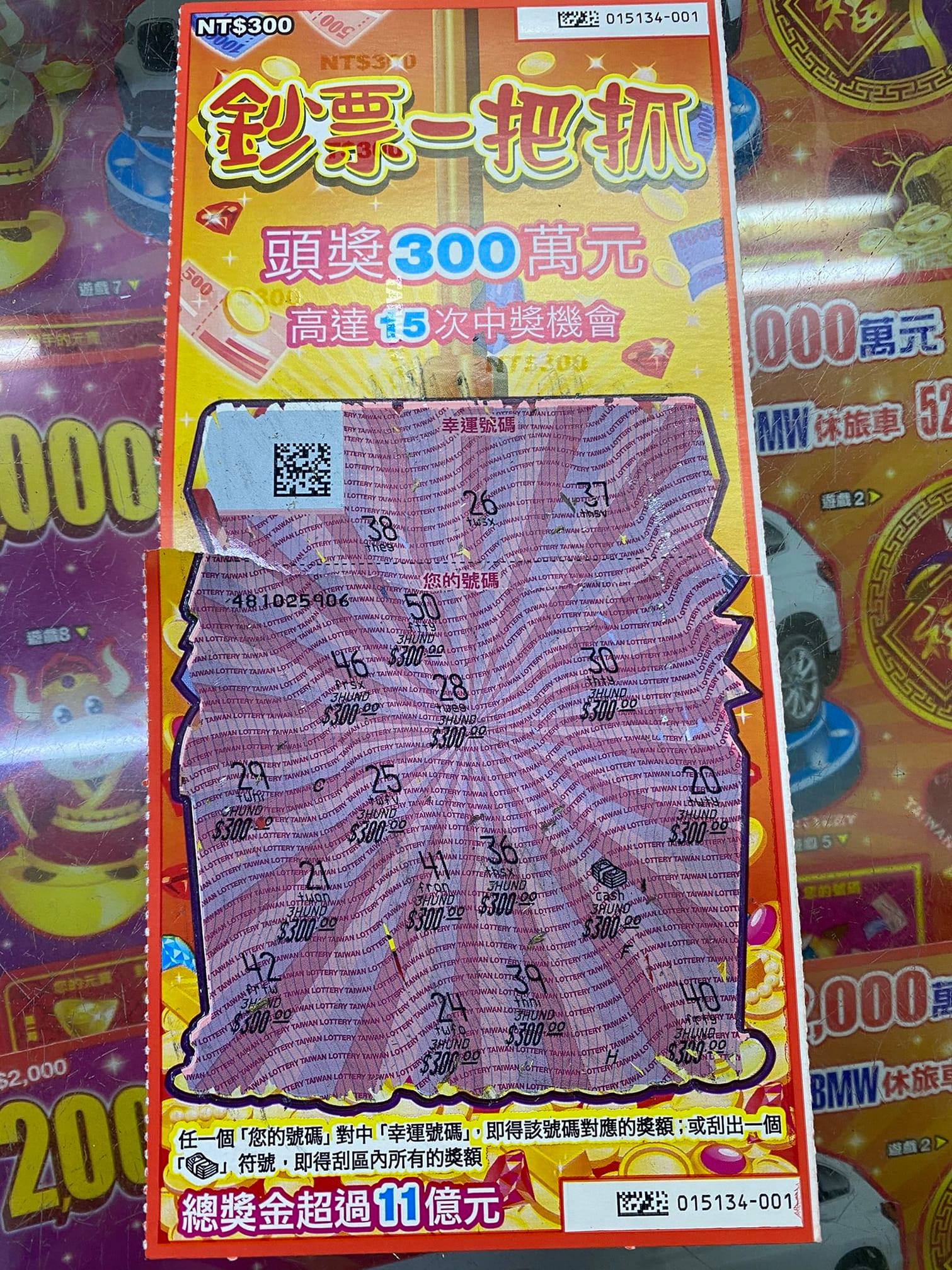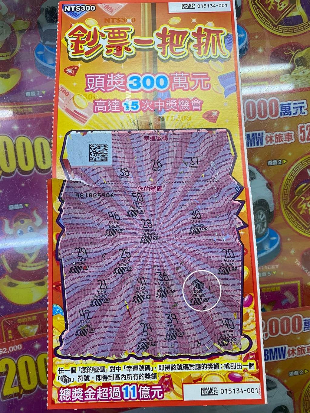 ▼從原po貼出來的刮刮樂照片可以看到,上面寫著:「任一個『您的號碼』對中『幸運號碼』,即得該號碼對應獎額。」頭獎為300萬元獎金,中獎的機會高達15次,但號碼一個都沒有對中,讓人以為槓龜了。但刮刮樂上還有一行小字:「刮出1個『1疊鈔票』符號,即得刮區內所有獎額。」這張刮刮樂上正好有「1疊鈔票」符號。