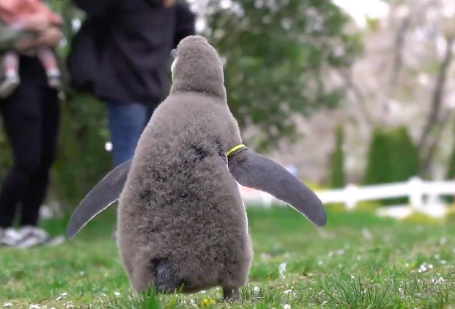 ペンギンのヒナが初めて見る桜吹雪を不思議そうに眺めているだけの動画。