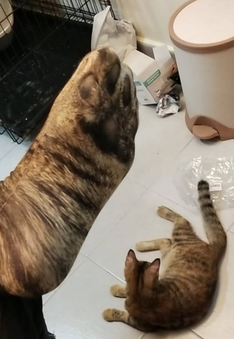 貓咪看到奴才的同款虎斑貓腳時驚恐萬分的表情太可愛了,爸爸能想到這個方式來逗貓,也真的是很有創意!