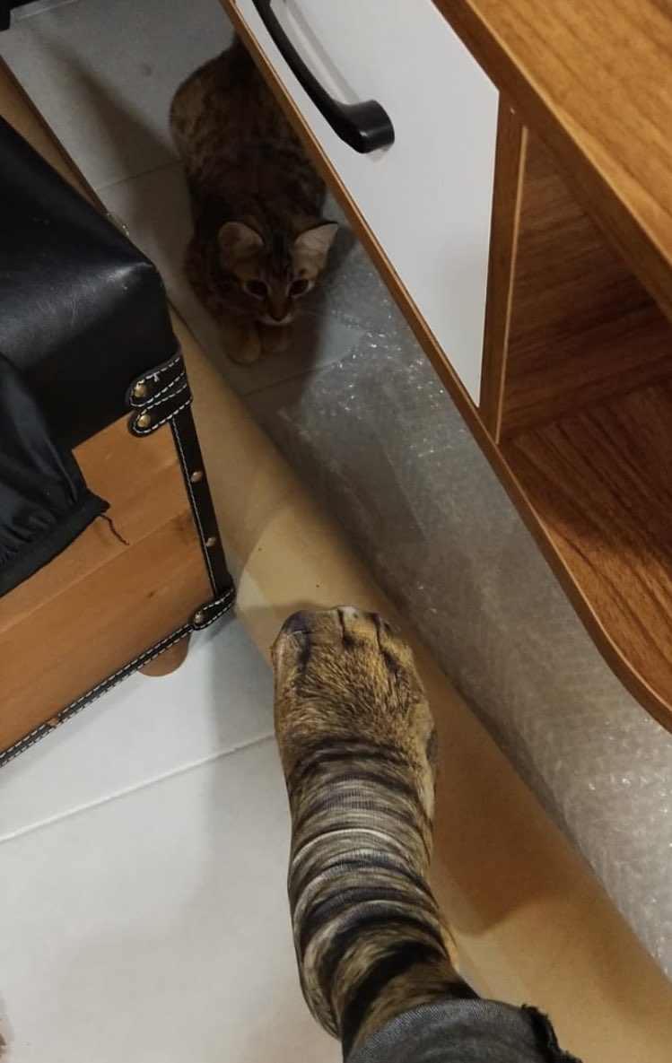 ▼國外一名網友 Majed在推特上分享了這個可愛的故事,她的爸爸因為太愛主子,每天都在想怎麼讓主子更開心,一天爸爸突發奇想,上網訂了一雙和家裡的虎斑貓Omei同樣花色的襪子,想要藉此跟主子更親近。