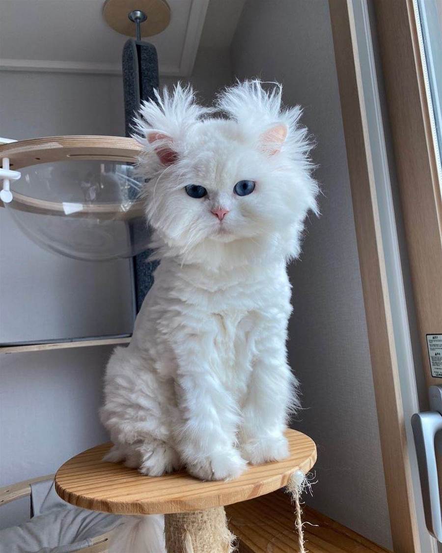長得好潦草!厭世白貓頭上頂「炸毛蒲公英」 網一看全笑了:早上剛起床的我