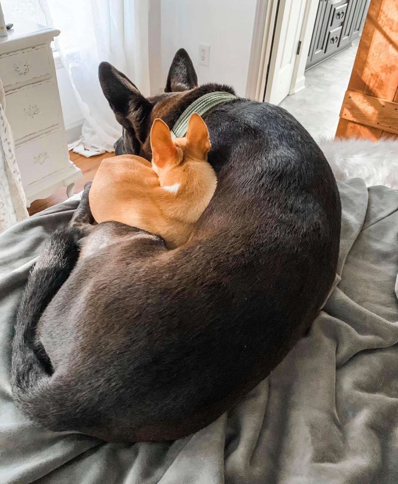 ▼Pickles也不像其他小狗一樣,牠小小的身體裡似乎有無限的力量,每天陪Merlin玩耍,Merlin的精力都不如牠!一大一小兩隻狗狗依偎在一起的畫面很溫馨。