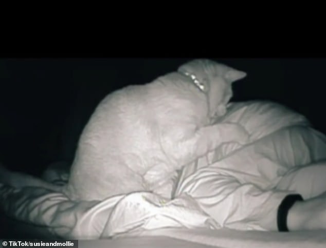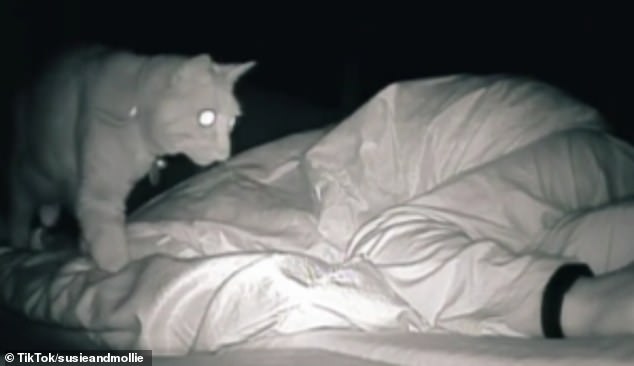 ▼這名女子表示,她每天都睡不好,醒來後總是覺得很累。為了找出原因,她在床邊架設一台監視器,拍攝自己睡覺的過程。從監視器畫面中可以看到,臥室裡一片漆黑,她睡得非常香甜,她的愛貓Ginger突然跳上床,坐到她的旁邊,伸出前爪不停拍打她的手臂和身體。