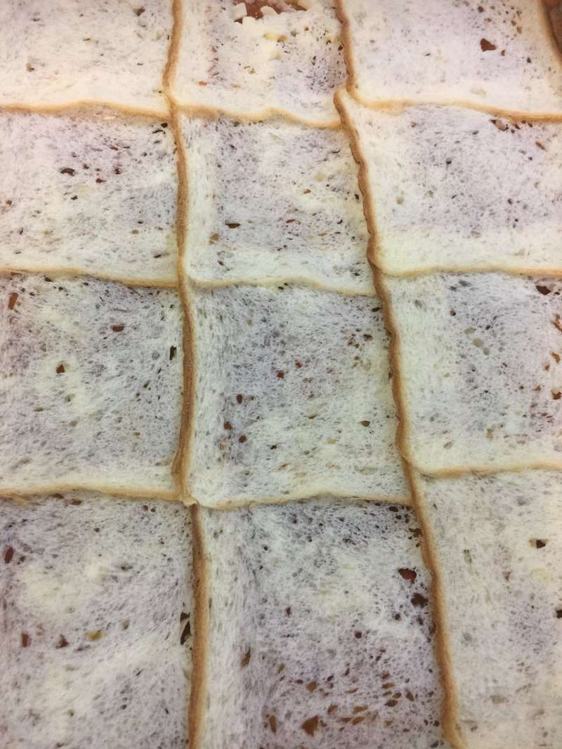▼將切成薄片的吐司片排開,真令人佩服的五體投地。