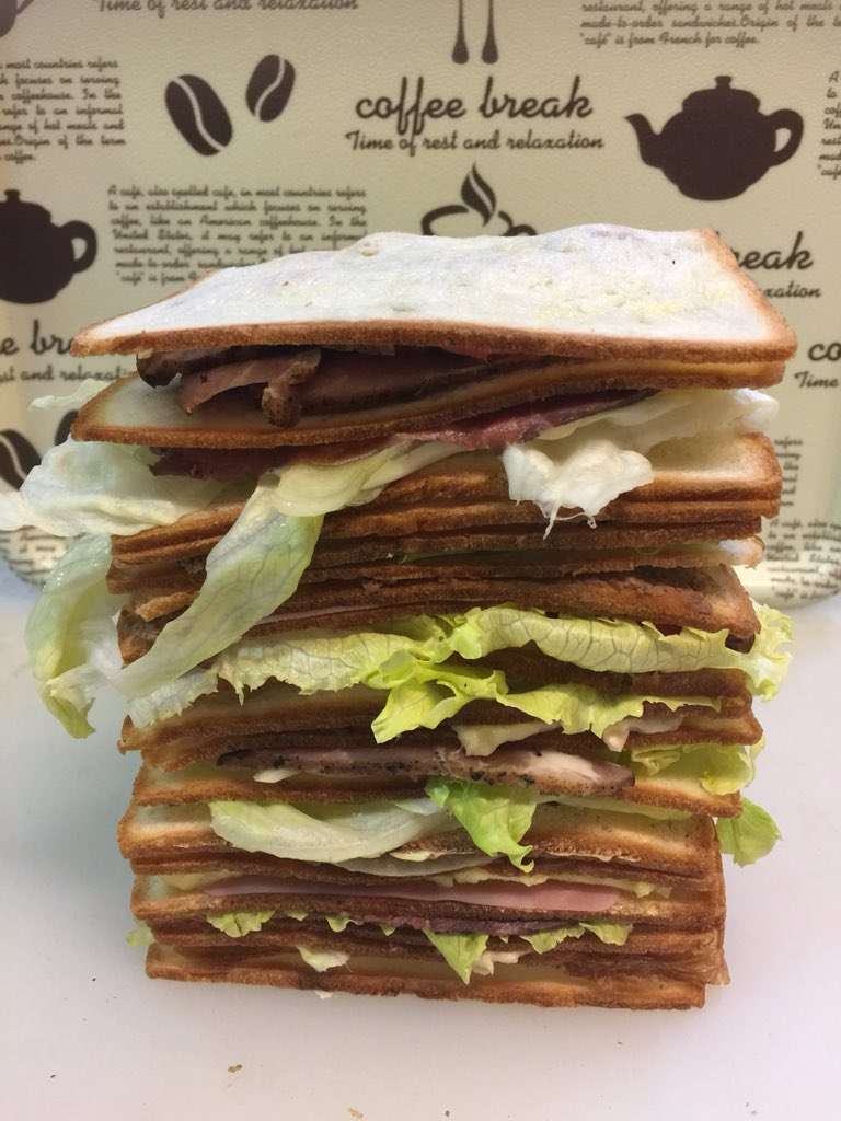 ▼他使用的手動切片器所能設定的最薄厚度是2mm,成功把半條吐司切成47片,並且塗上奶油堆疊起來做成了三明治。