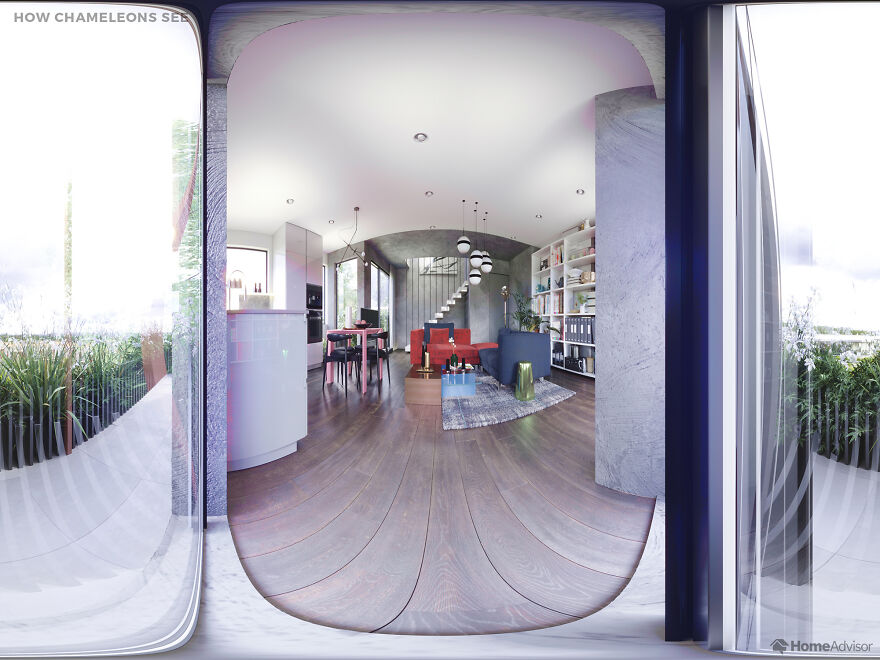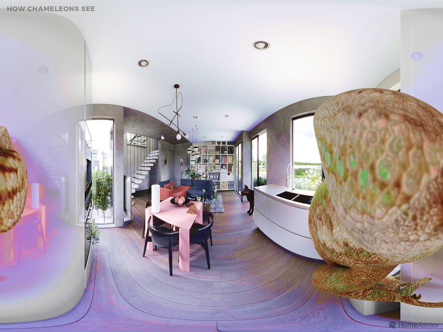 ▼變色龍視角:在以上所有的寵物中,最在乎主人家裝潢的應該就是變色龍了。牠吸收、變換和重新發射顏色,牠們的眼睛幾乎都是視錐細胞,而沒有視桿細胞,所以牠能夠看到很多顏色,包括紫外線,不過牠的眼睛對色彩的對比度不敏感。變色龍的視力非常好,牠們擁有342度的超大廣角,只有在頭後方有18度看不見的視角。