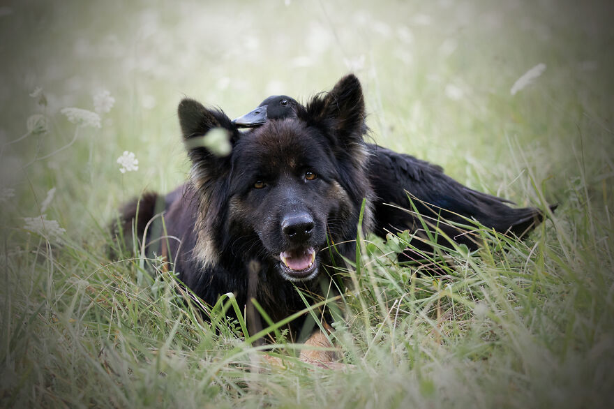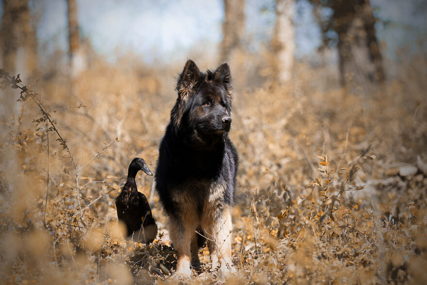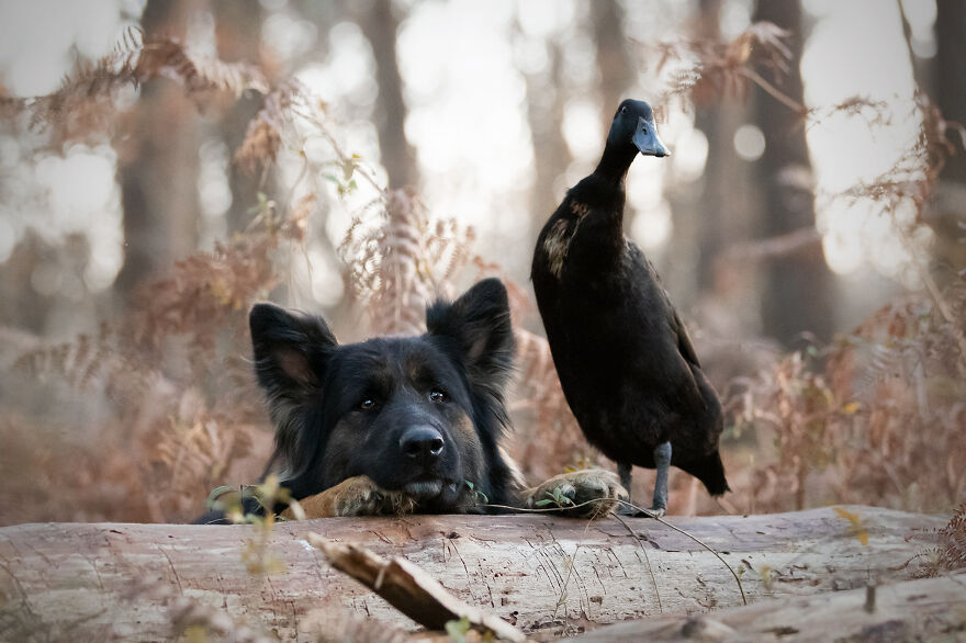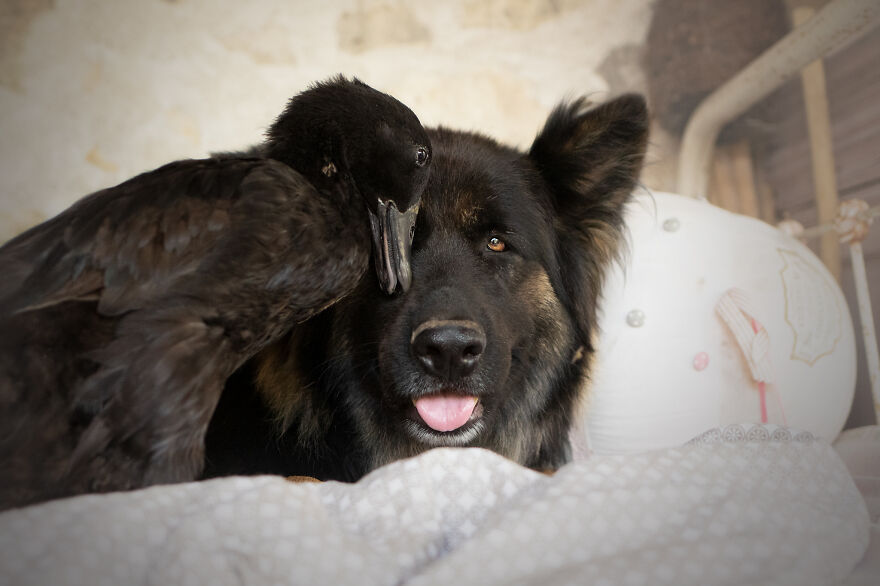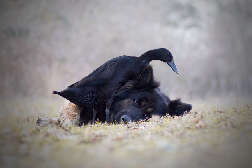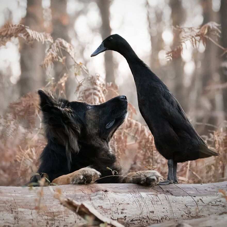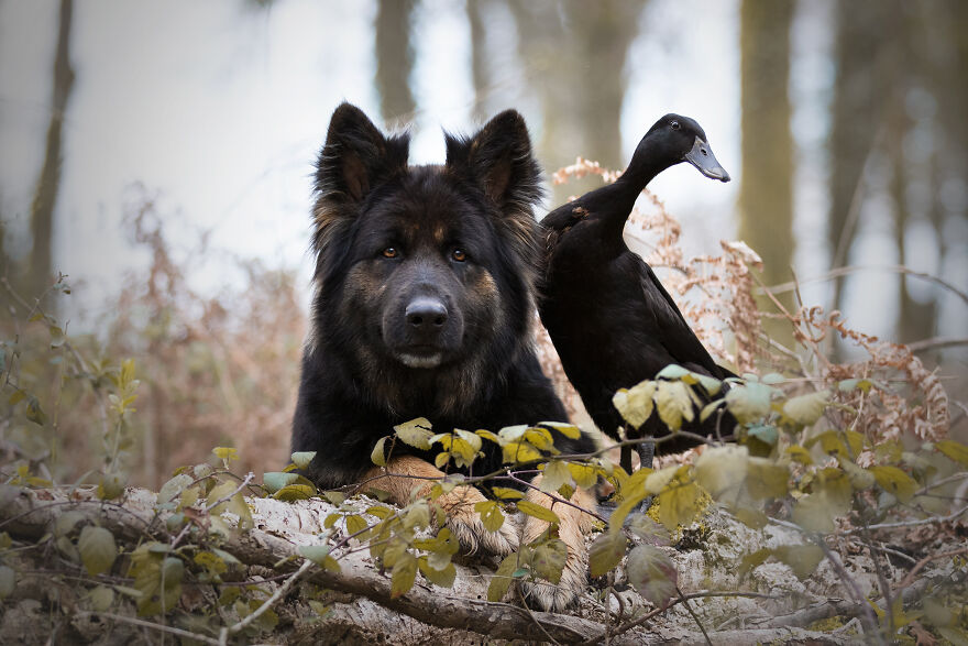 2021年01月28日我們看到過不少動物之間跨物種的友誼,在業餘攝影師Natacha家裡,就有德國牧羊犬Vendetta,印度跑鴨Lemony,還有兩隻鴿子Grisella和Heldig,奇妙的是,牠們都是親密無間的好朋友,一起出鏡時如童話般美好的畫面總是能夠融化人心!